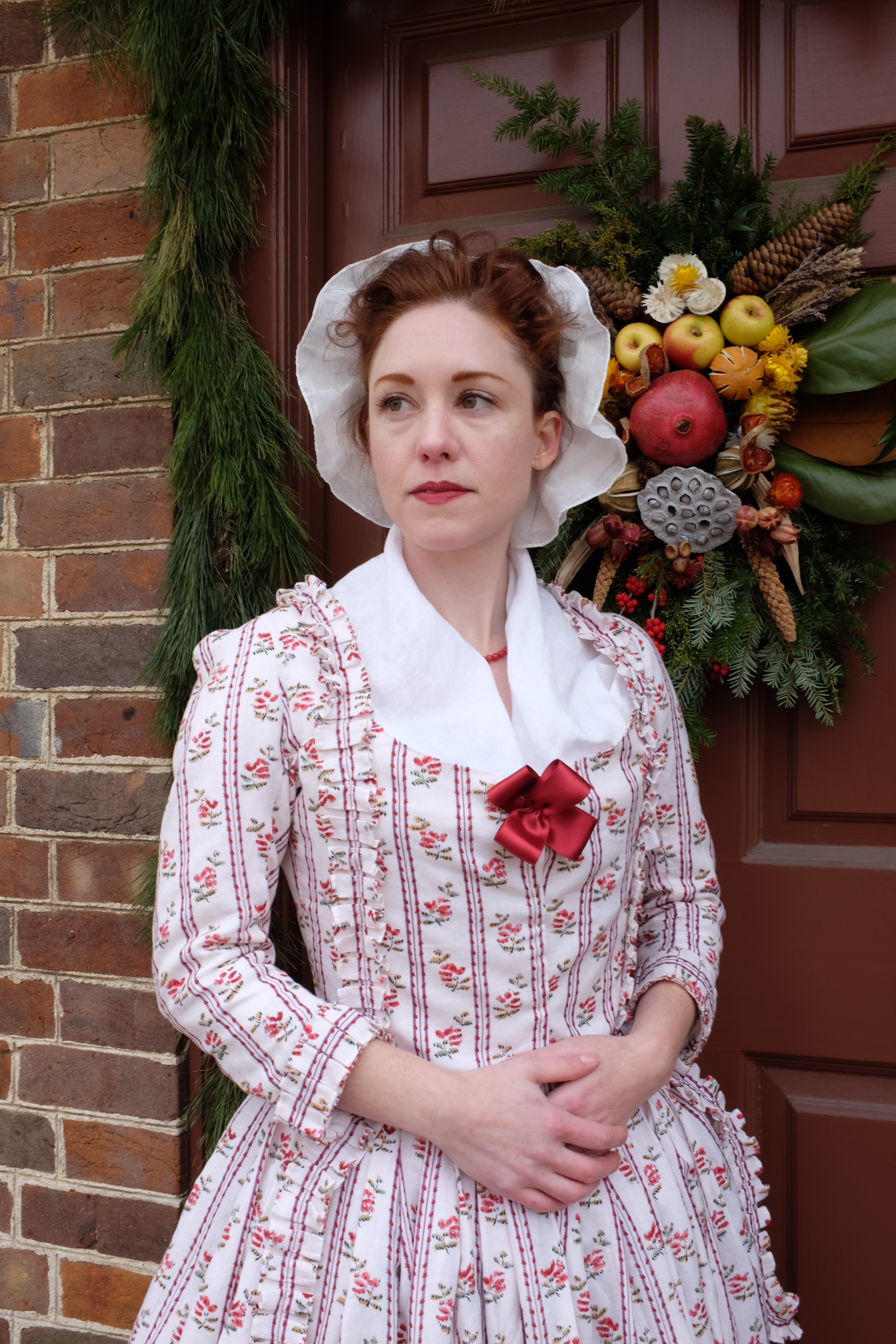 My husband is an excellent gift giver, and this year he really outdid himself: we went to Colonial Williamsburg for the Grand Illumination. And of course, I brought the Felicity caraco and petticoat. I finished my new, more formal cap in the car on the way down, because of course I did! I used the "Elise" pattern from Virgil's Fine Goods and the finest linen I've ever handled from Penny River Costumes. While you can't see the ribbon in most of the photos, it is of course the same burgundy shade as Felicity's cap ribbon, matching the breast knot on my jacket. I got both widths of silk ribbon at Needle & Thread.